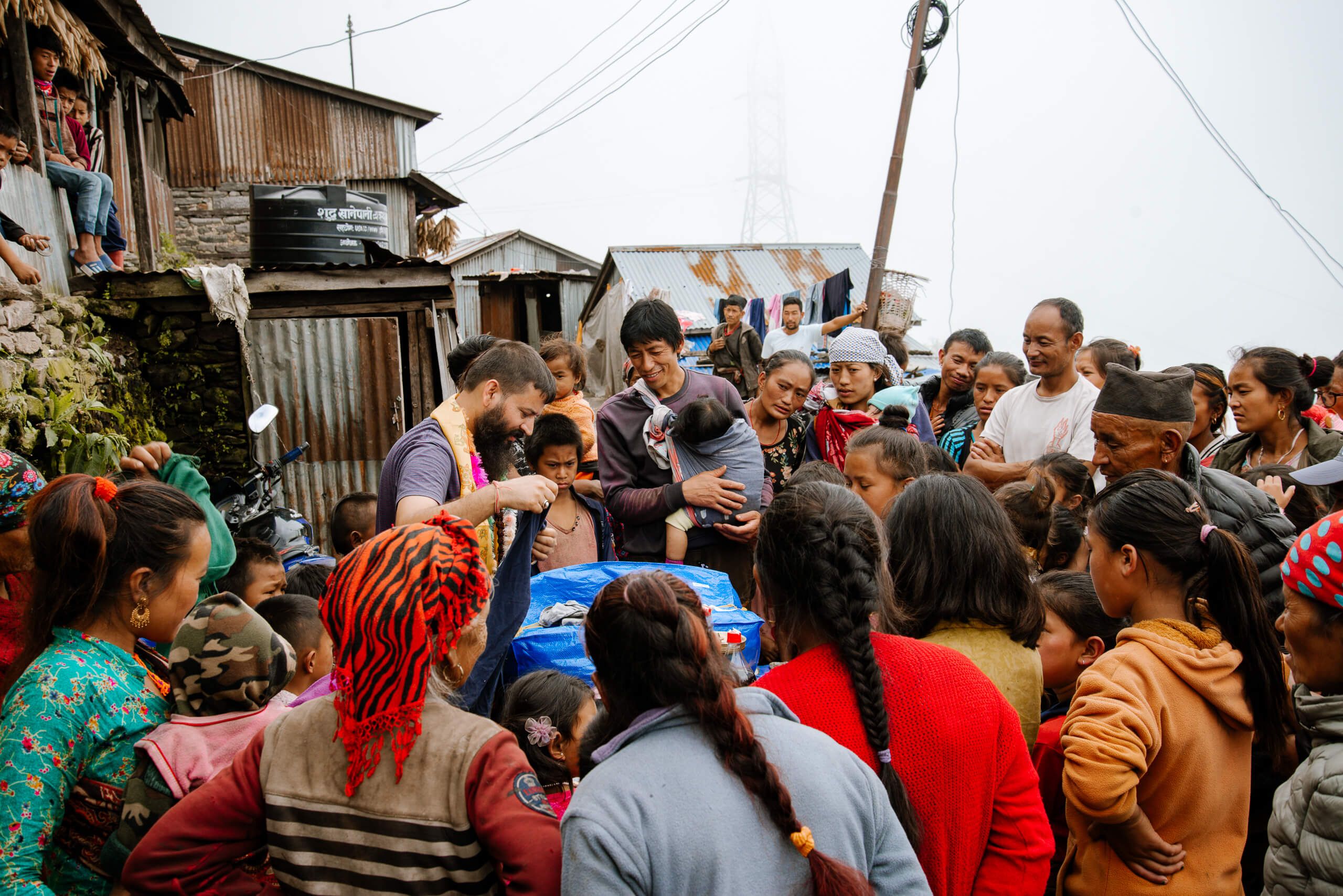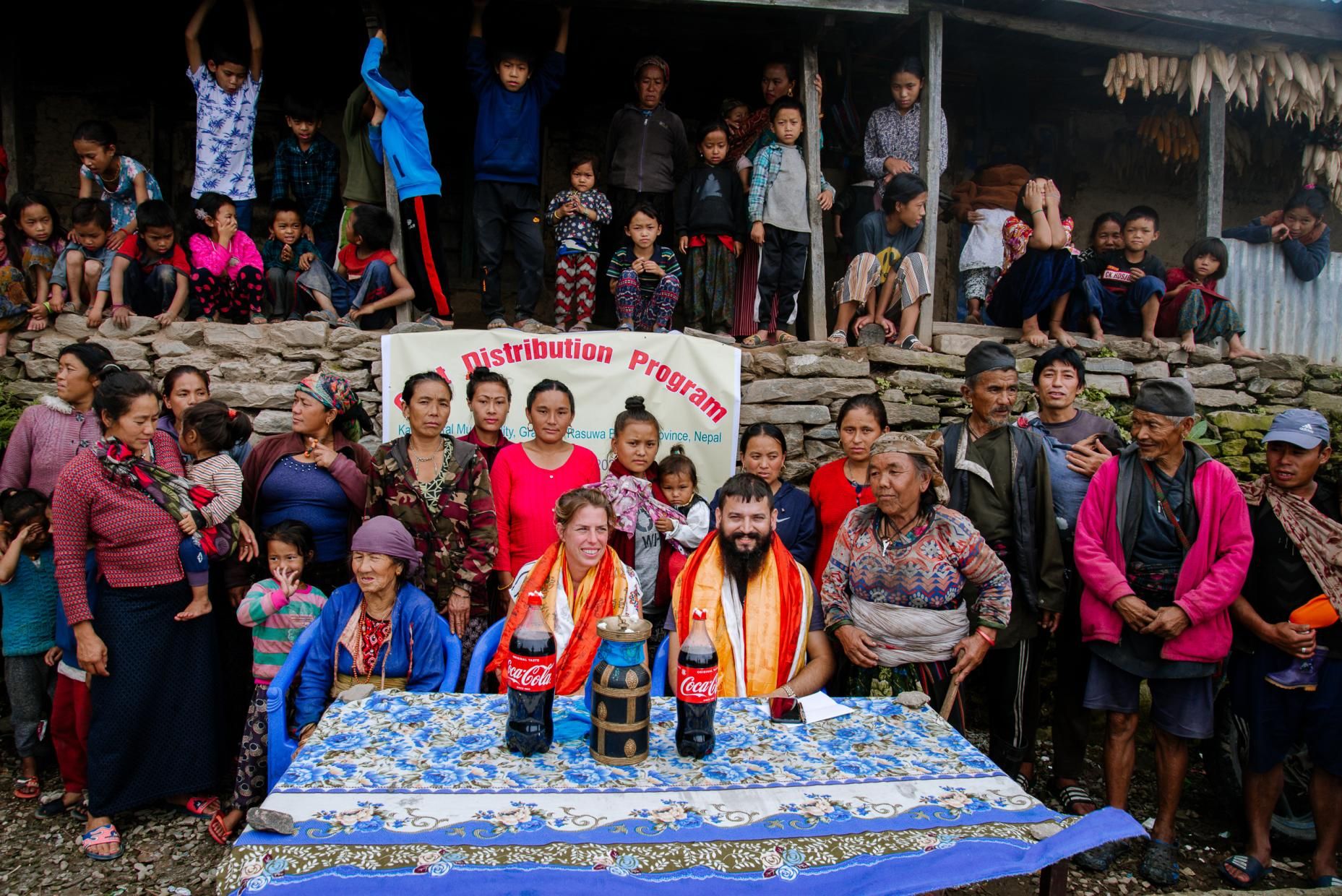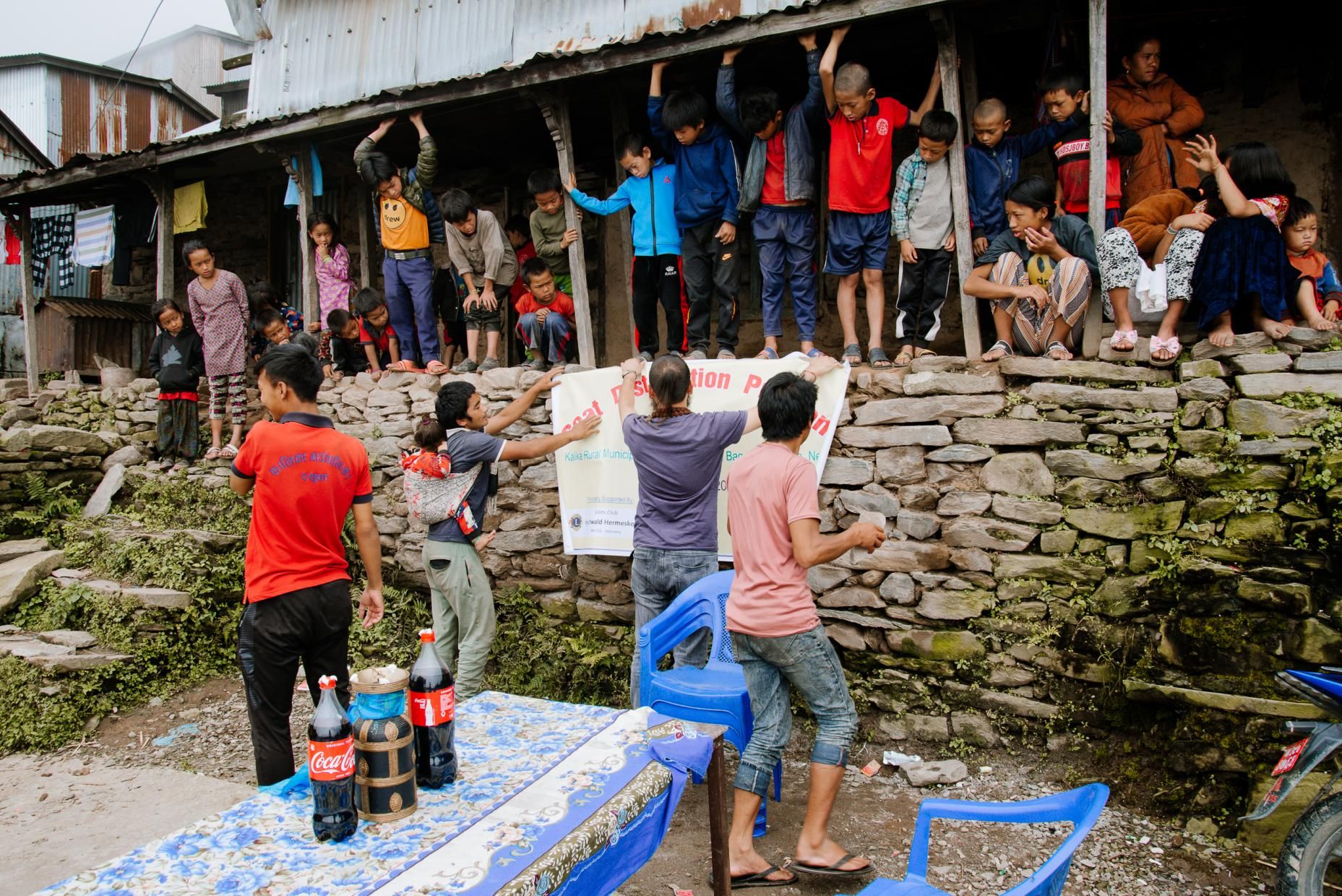 At 1.30 p.m. we finally reached the village. The fog hung deep so that the view was very limited. The picture that offered me was a bit sad. Since the earthquake, perhaps three or four families have been able to build up a stone house again - the rest still lives in corrugated iron huts. A table was already prepared for a larger group of houses. And no, Coca Cola is not a sponsor of our projects - Cola is one of the few luxury goods they afford, and they wanted to share this with us. Therefore, the two bottles are on the table. The banner, which we had produced in Kathmandu the day before, was attached and more and more villagers gathered. Many children, an incredible number of children stood around. My heart got a little more difficult because I already knew that I had brought far too few children's clothes with me.