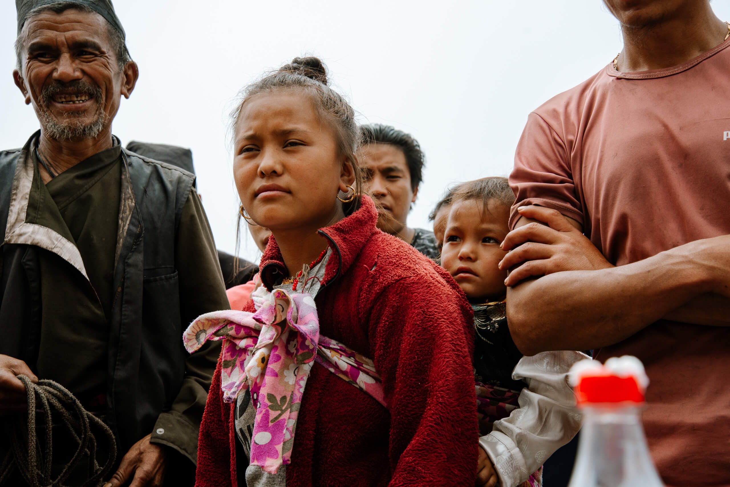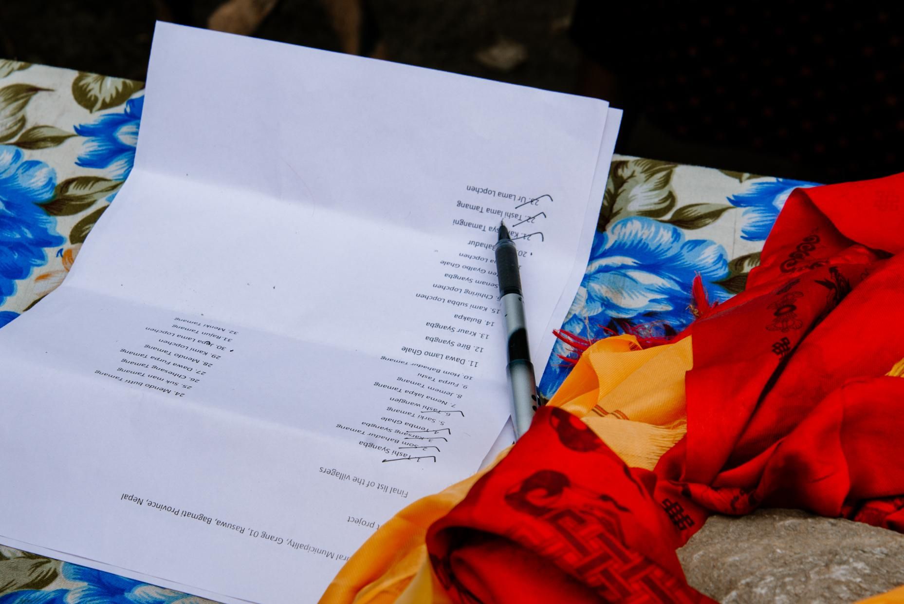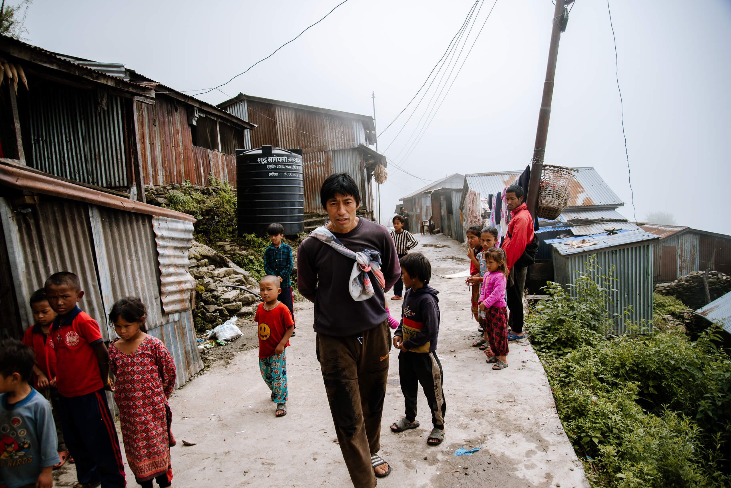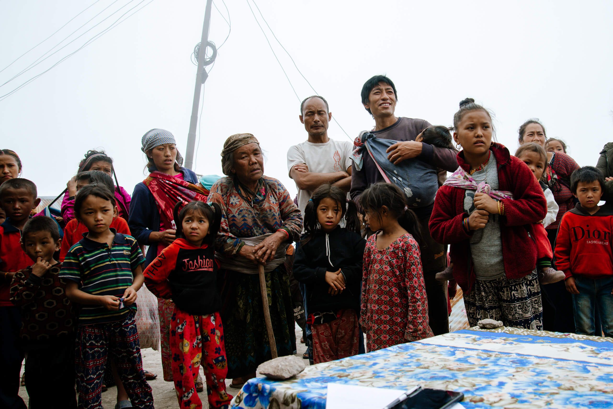 At 1.30 p.m. we finally reached the village. The fog hung deep so that the view was very limited. The picture that offered me was a bit sad. Since the earthquake, perhaps three or four families have been able to build up a stone house again - the rest still lives in corrugated iron huts. A table was already prepared for a larger group of houses. And no, Coca Cola is not a sponsor of our projects - Cola is one of the few luxury goods they afford, and they wanted to share this with us. Therefore, the two bottles are on the table. The banner, which we had produced in Kathmandu the day before, was attached and more and more villagers gathered. Many children, an incredible number of children stood around. My heart got a little more difficult because I already knew that I had brought far too few children's clothes with me.