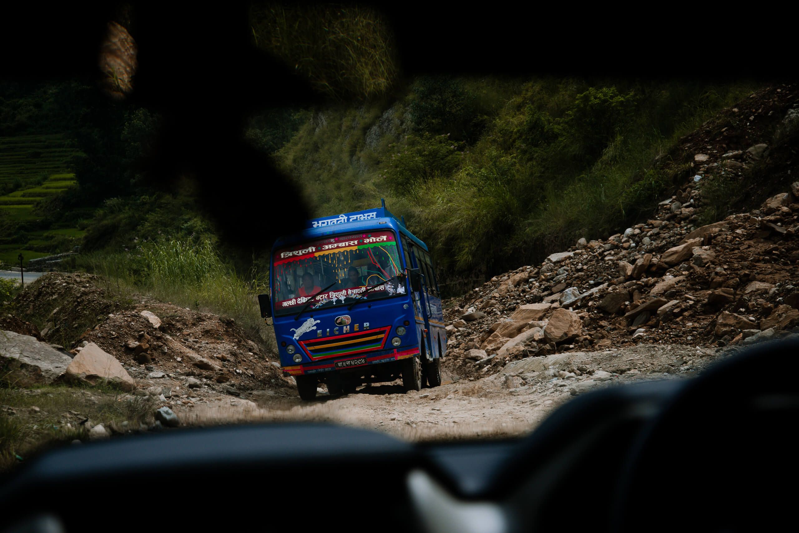In the morning at 6 a.m. we drove in Kathmandu. The “Nepali Highway” winds along the hill chains. After about 50 km we turned towards Langtang Valley. The next 60 km should now take place on no longer so good streets. Unfortunately, after a relatively short journey, a landslide blocked the street, so that we had to take the alternative street between the bidur and bazaar of the bazaar - which no longer deserves the name Strasse. The path was narrow and unpaved. Only clay and gravel. Thanks to the rainy season, it had a lot of puddles. As a result, we only progressed very slowly.