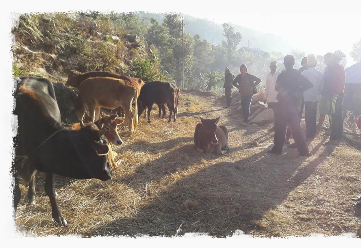 Kühe sind in Nepal heilige, Ihnen wird daher besonders gut geschaut. Auch hat es im Dorf genügend Grünzeug als Futter und als Medizin kennen Sie viele natürliche Arzneimmittel. Bei Bedarf kann auch ein Mediziner gerufen werden. Den Tieren wird es sicher gut gehen in Bhumesthan.